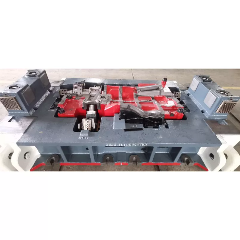 অটোমোটিভ ফ্রন্ট প্যানেল অ্যাসেম্বলি স্ট্যাম্পিং ডাইস হাইপারবোলয়েড গঠন এবং একটি সামঞ্জস্যযোগ্য প্রোফাইল কাঠামো ব্যবহার করে। CAE বিশ্লেষণ এবং প্রক্রিয়া অপ্টিমাইজেশানের সাথে মিলিত, এটি কুঁচকানো এবং ক্র্যাকিংয়ের মতো সমস্যাগুলি সমাধান করে, ±0.05 মিমি এর মধ্যে পৃষ্ঠের নির্ভুলতা অর্জন করে, সংলগ্ন উপাদানগুলির সাথে সামঞ্জস্যতা নিশ্চিত করে।